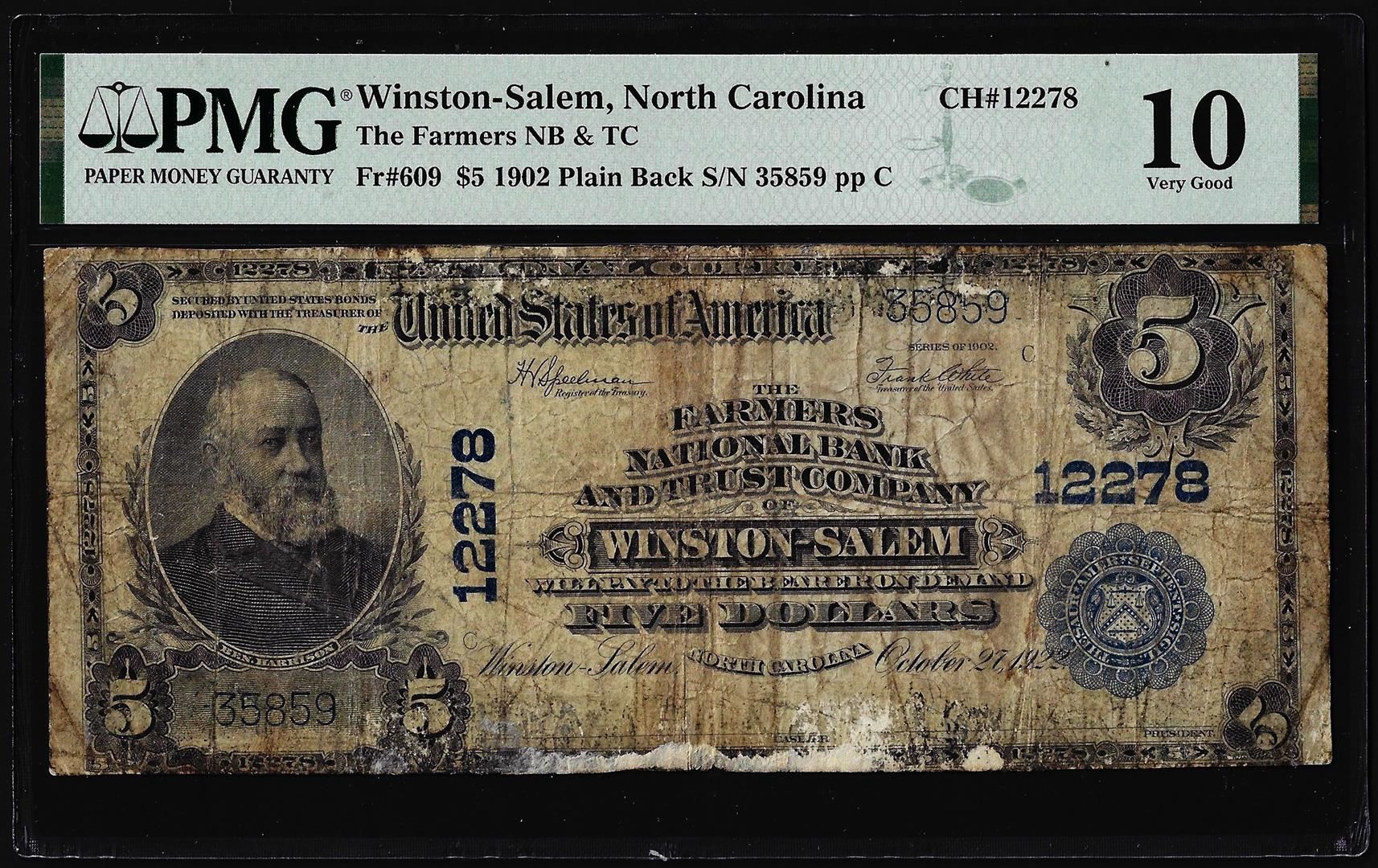 One 1902PB $5 Winston-Salem, NC National Currency Note CH# 12278 PMG Very Good 10. PMG Certified.