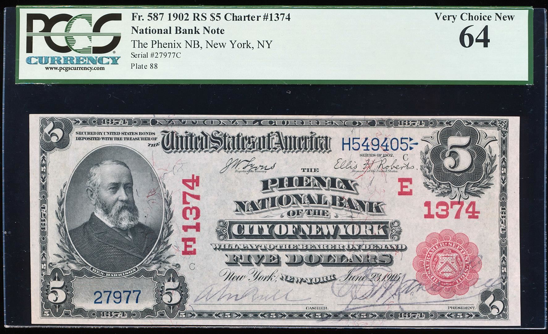 One 1902RS $5 Phenix National Bank New York, NY National Currency Note PCGS Choice New 64. PCGS Graded.