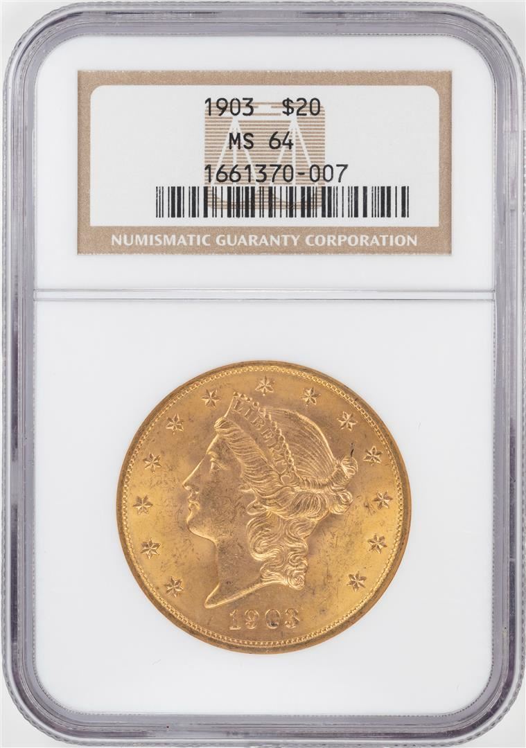One 1903 $20 Liberty Head Double Eagle Gold Coin NGC MS64. NGC Certified.