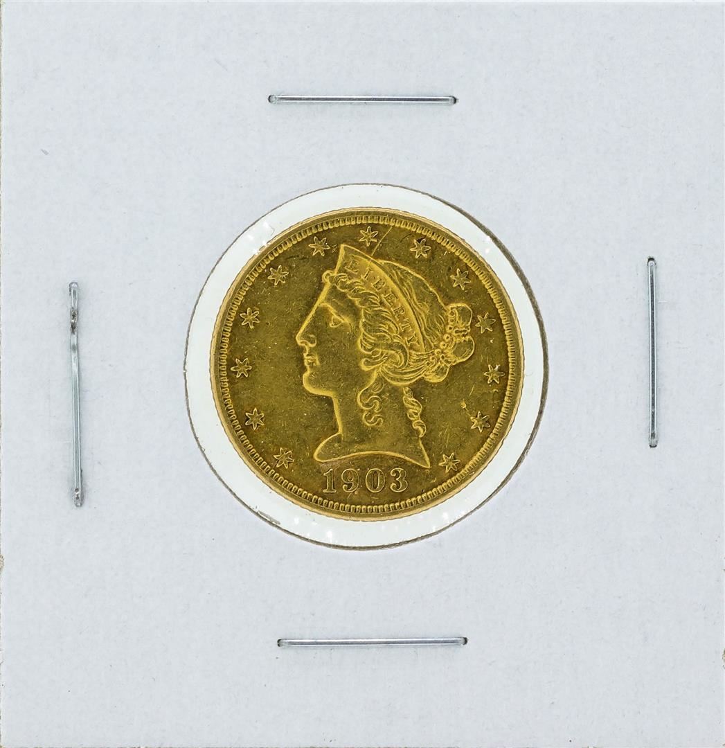 One 1903 $5 Liberty Head Half Eagle Gold Coin.