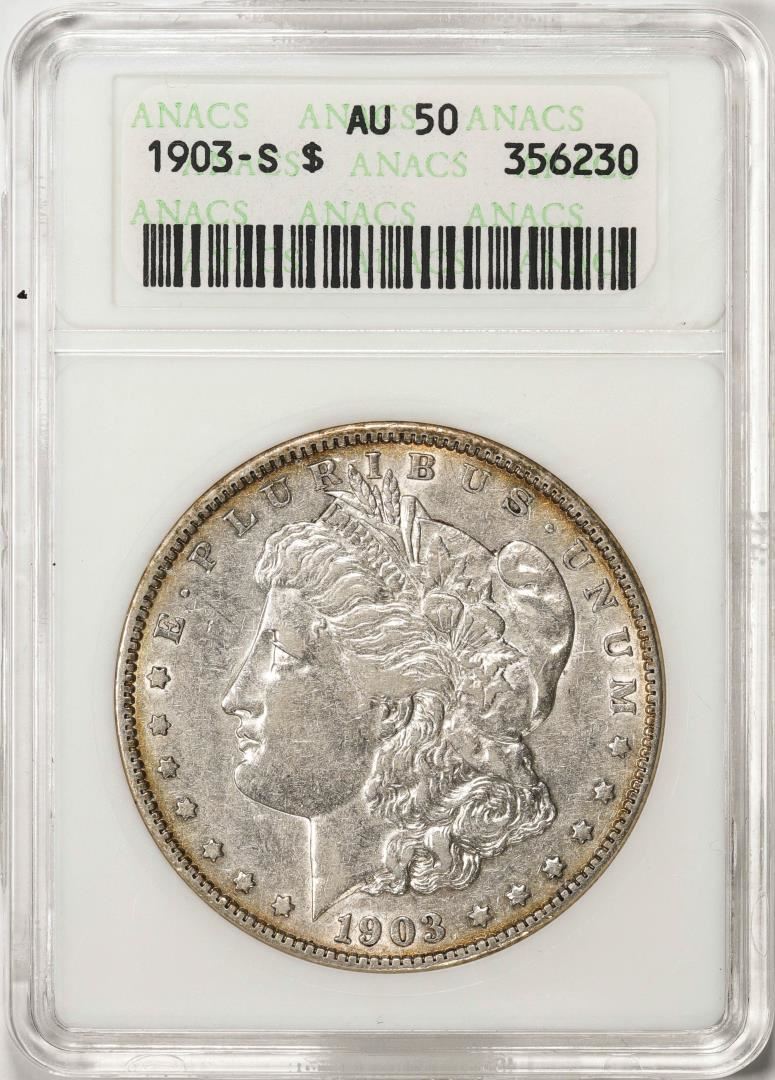 One 1903-S $1 Morgan Silver Dollar Coin ANACS AU50 Old Soap Box Holder. ANACS Certified.
