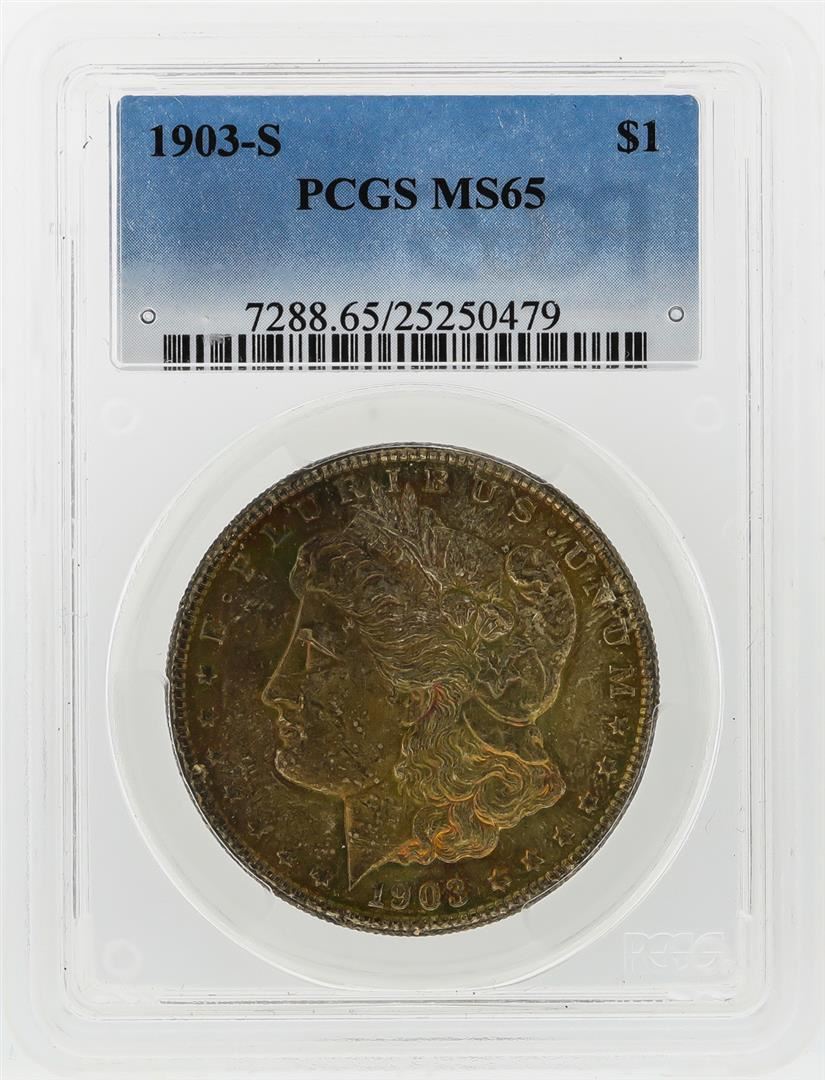 1903-S $1 Morgan Silver Dollar Coin PCGS Graded MS65. A late-series semikey date, the 1903-S is elusive in grades through MS65 and is rare any finer. This Gem example exhibits radiant mint shining through a blanket of forest-green, cherry-red, and golden-brown toning on each side. The strike is sharp in details and the surfaces are free of any mentionable abrasions. PCGS Graded.