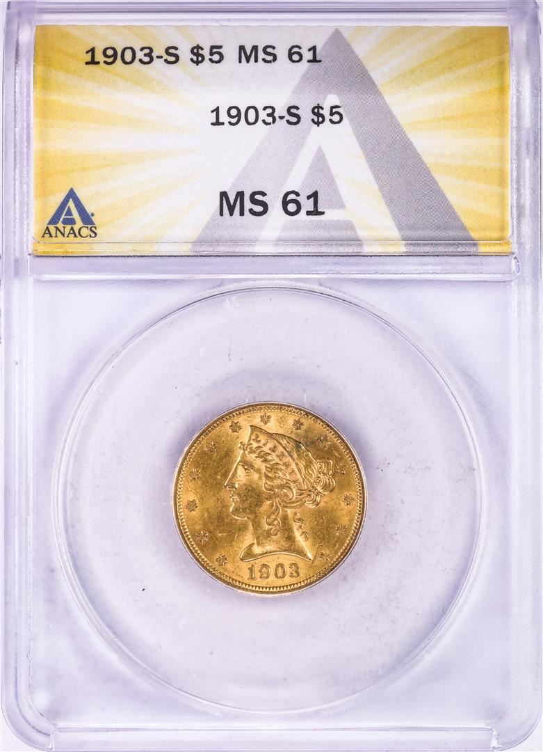 One 1903-S $5 Liberty Head Half Eagle Gold Coin ANACS MS61. ANACS Certified.