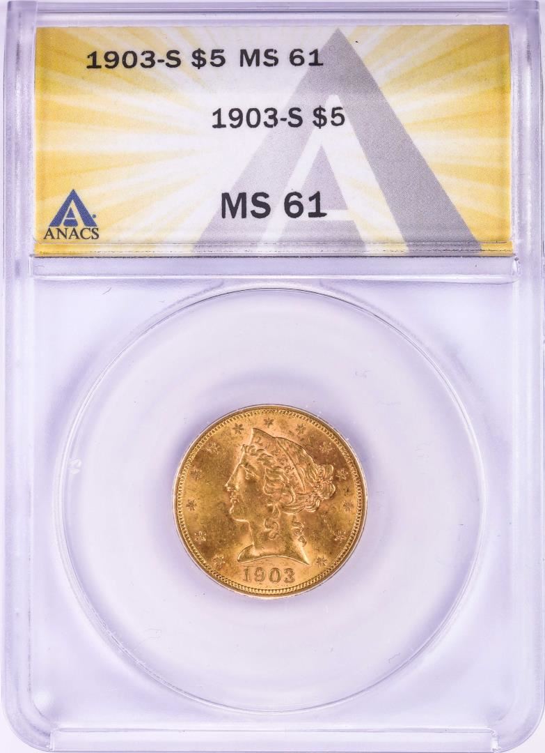 One 1903-S $5 Liberty Head Half Eagle Gold Coin ANACS MS61. ANACS Certified.