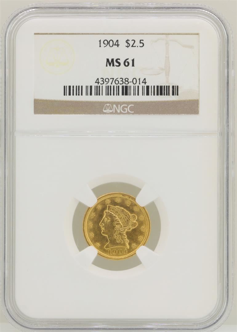 One 1904 $2 1/2 Liberty Head Quarter Eagle Gold Coin NGC MS61. NGC Certified.