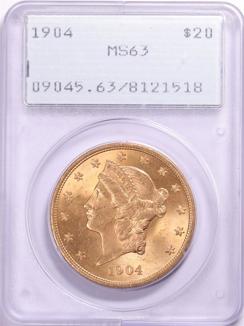 One 1904 $20 Liberty Head Double Eagle Coin PCGS MS63 Old Rattler Holder. PCGS Graded.