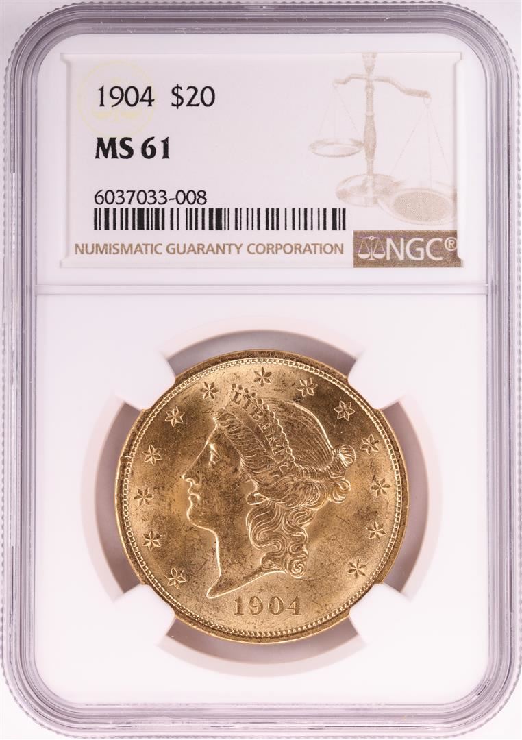 One 1904 $20 Liberty Head Double Eagle Gold Coin NGC MS61. NGC Certified.