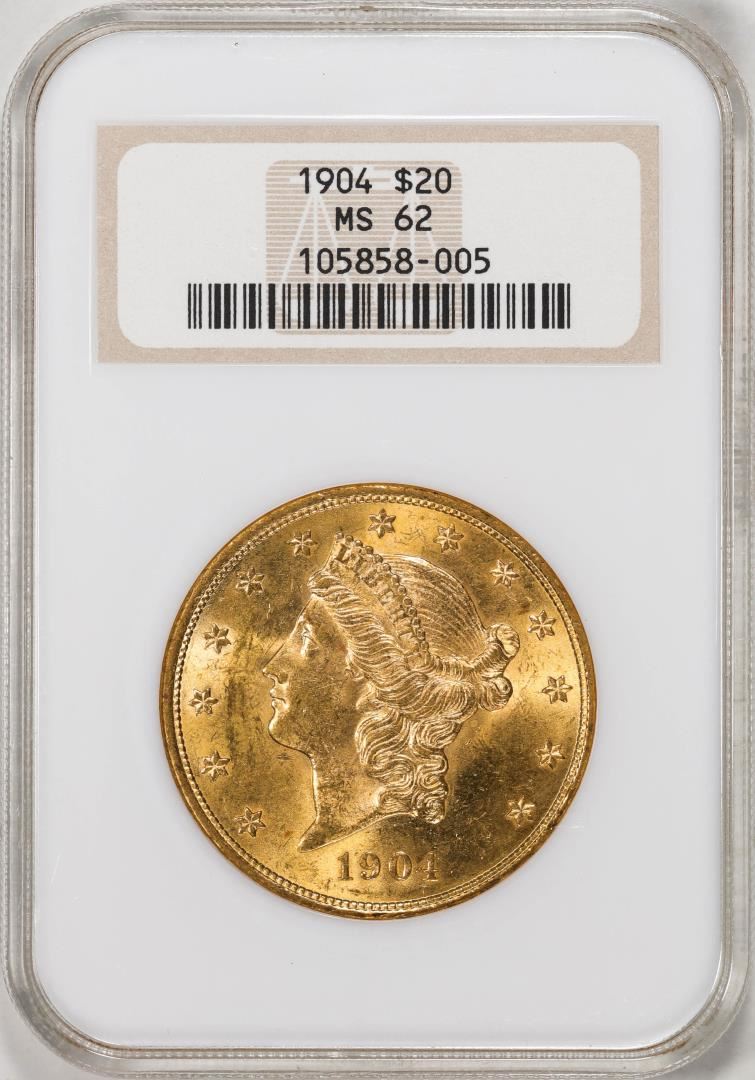 One 1904 $20 Liberty Head Eagle Gold Coin NGC MS62. NGC Certified.