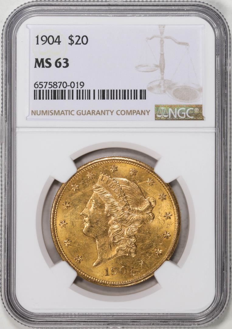 One 1904 $20 Liberty Head Eagle Gold Coin NGC MS63. NGC Certified.