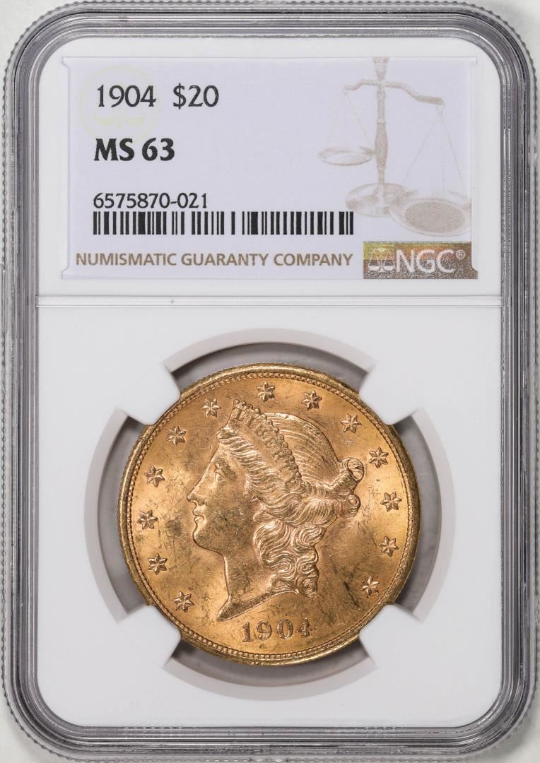 One 1904 $20 Liberty Head Eagle Gold Coin NGC MS63. NGC Certified.