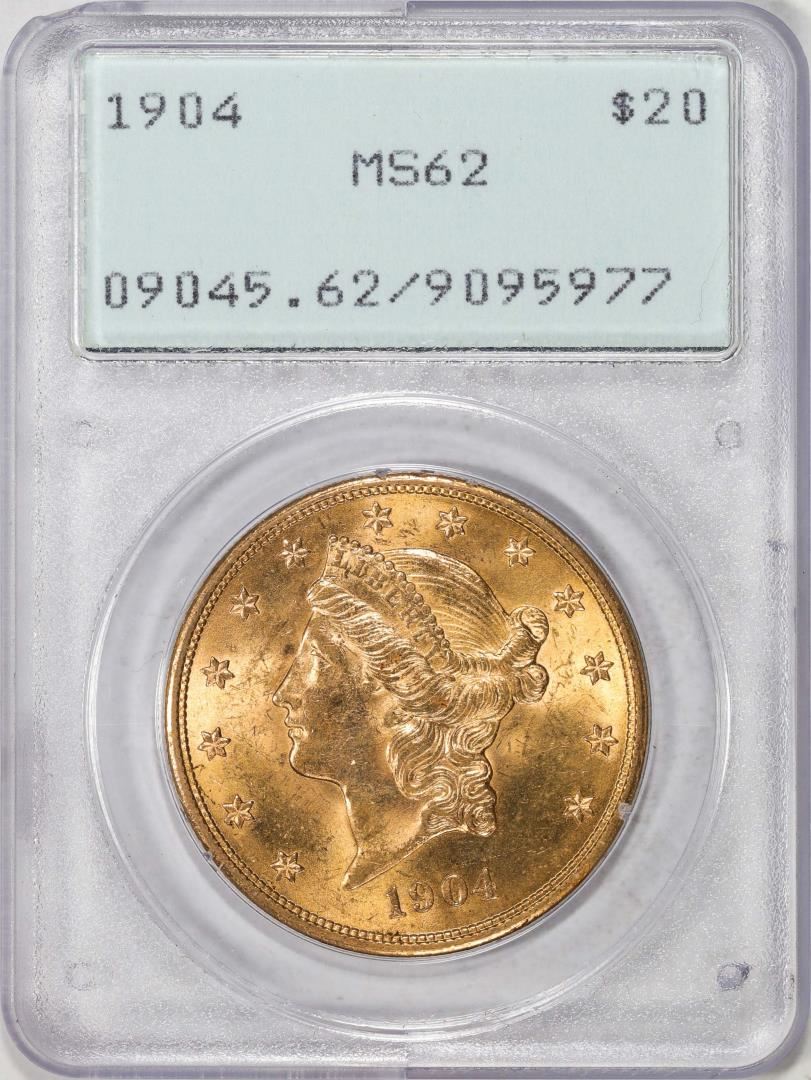One 1904 $20 Liberty Head Eagle Gold Coin PCGS MS62 Old Green Rattler. PCGS Graded.
