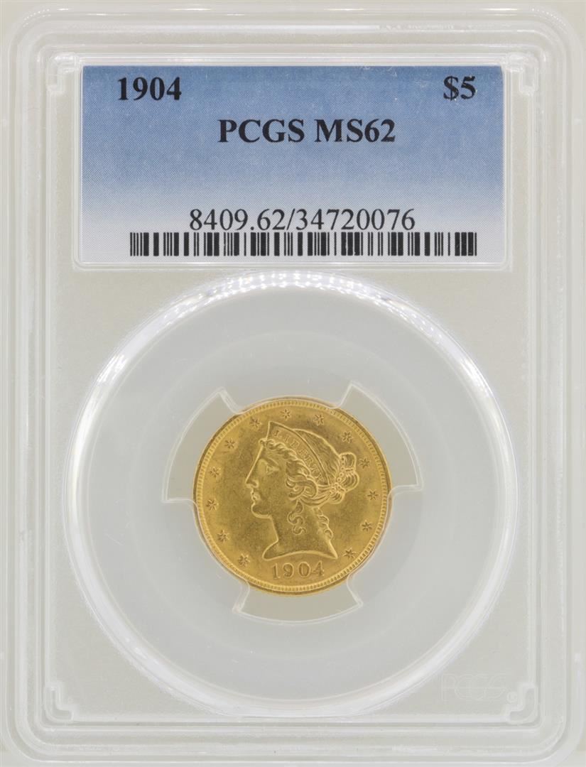 One 1904 $5 Liberty Head Half Eagle Gold Coin PCGS MS62. PCGS Graded.