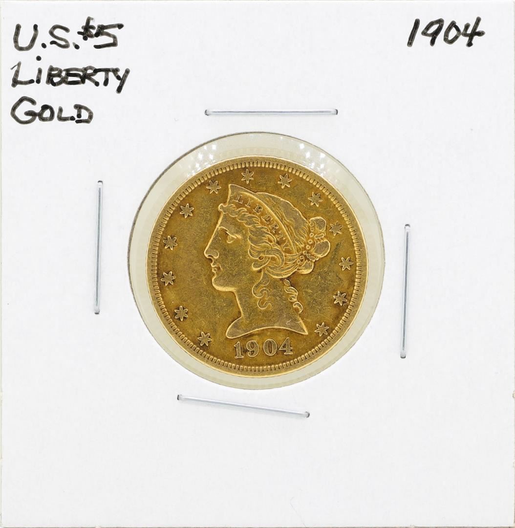 One 1904 $5 Liberty Head Half Eagle Gold Coin.