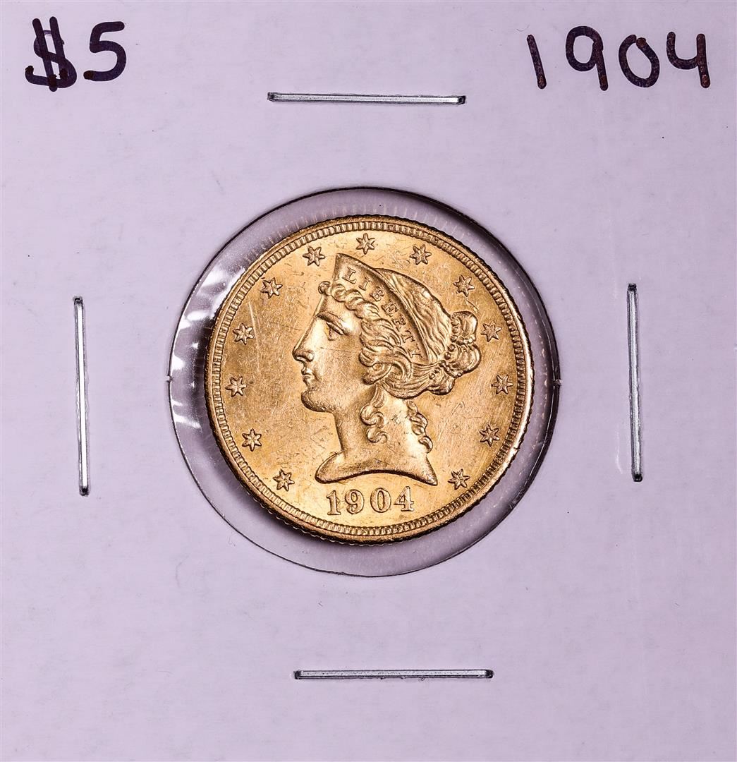 One 1904 $5 Liberty Head Half Eagle Gold Coin.
