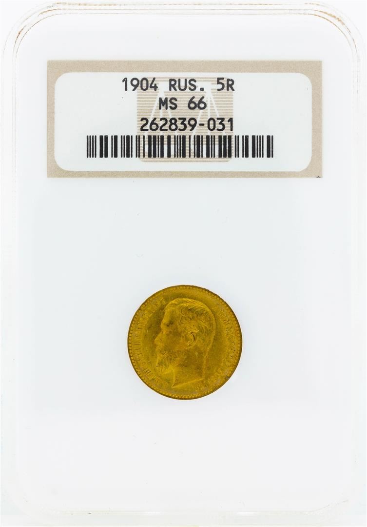 One 1904 Russia 5 Roubles Gold Coin NGC MS66. NGC Certified.