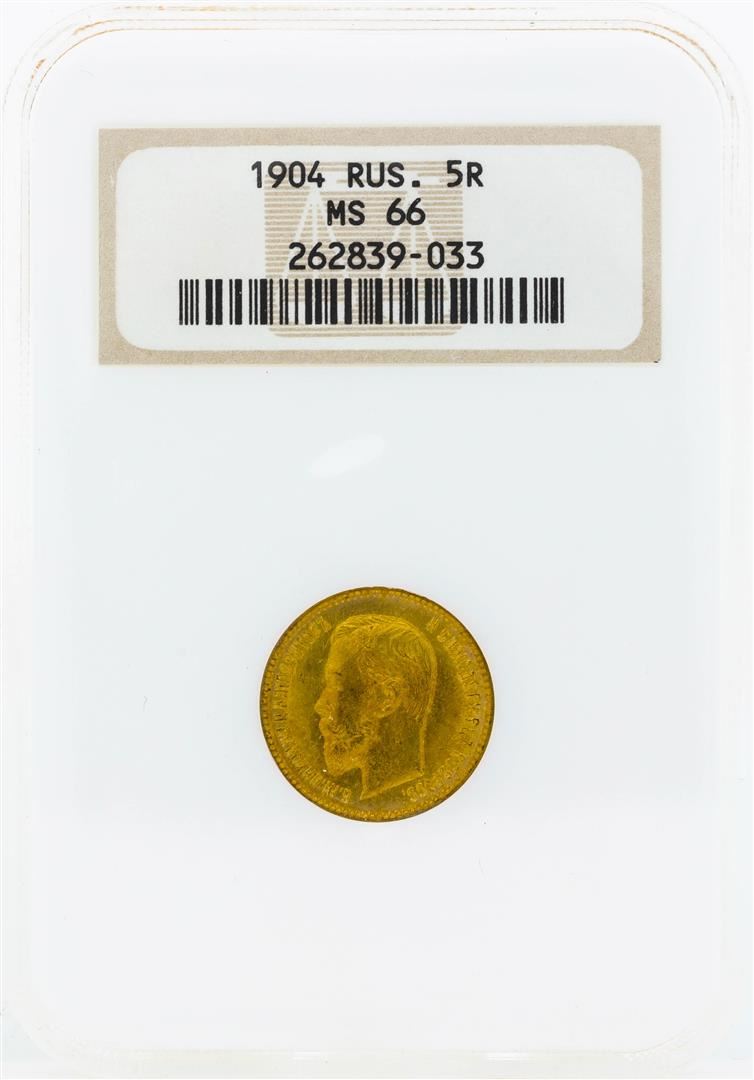 One 1904 Russia 5 Roubles Gold Coin NGC MS66. NGC Certified.