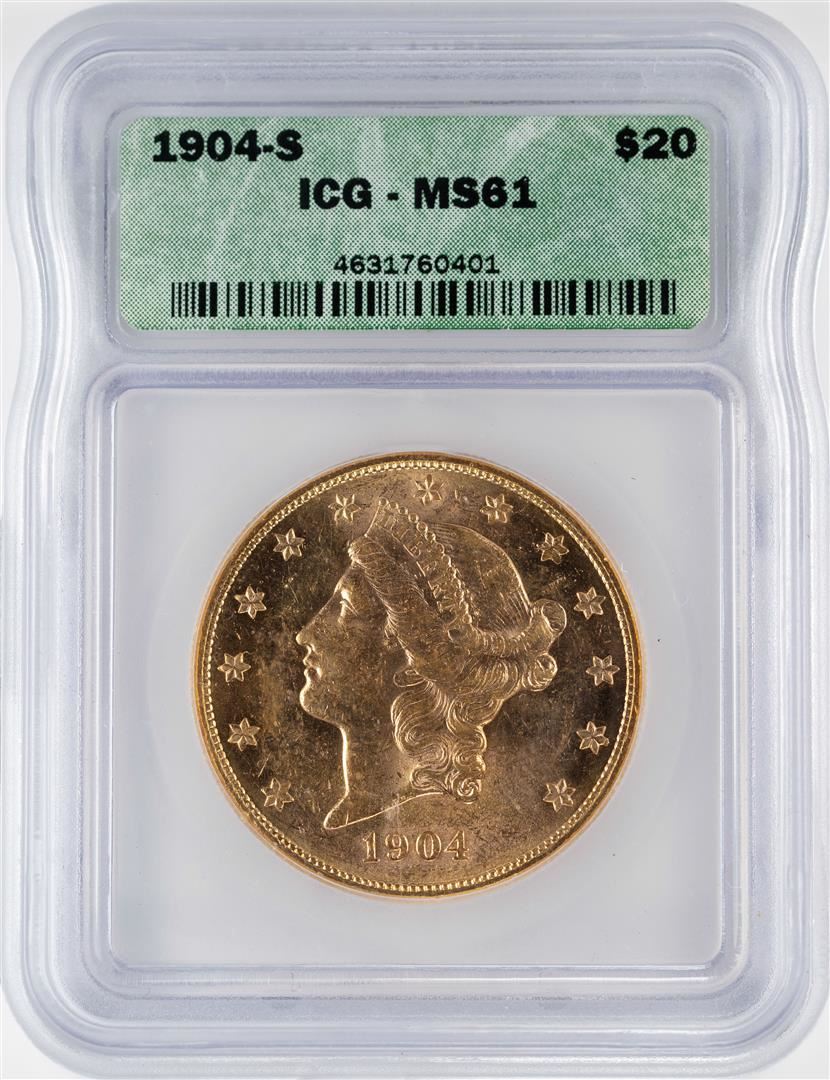 One 1904-S $20 Liberty Head Double Eagle Gold Coin ICG MS61. ICG Certified.