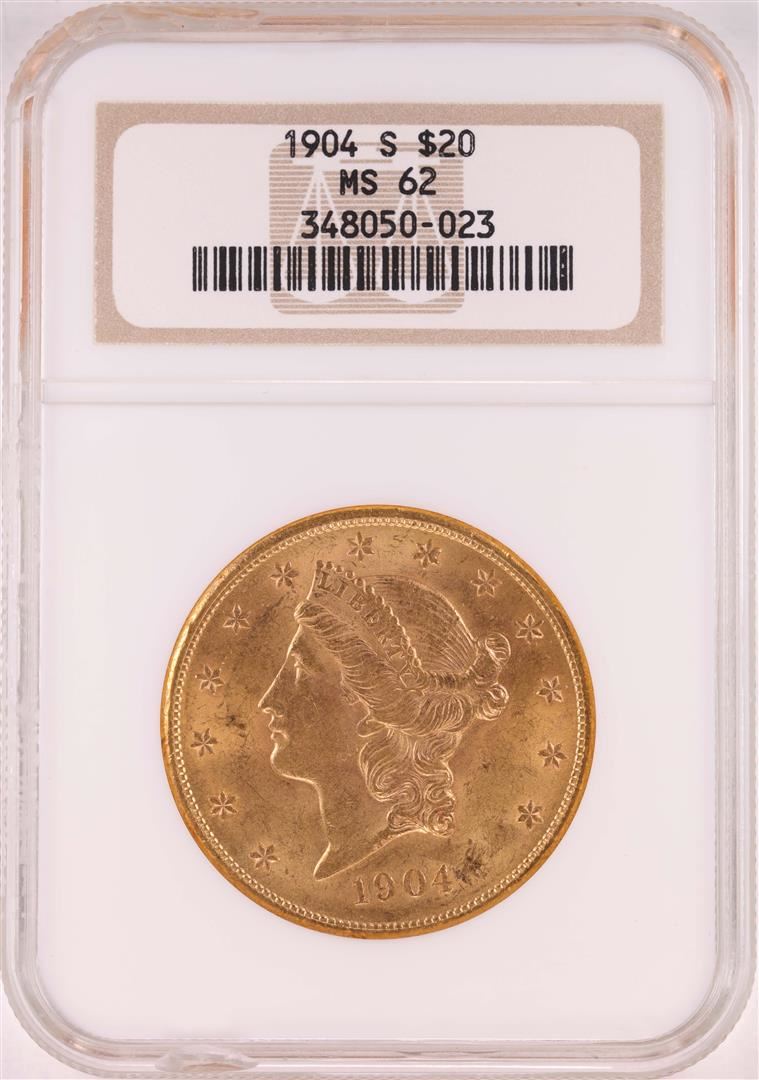 One 1904-S $20 Liberty Head Double Eagle Gold Coin NGC MS62 - Chipped Slab. NGC Certified.