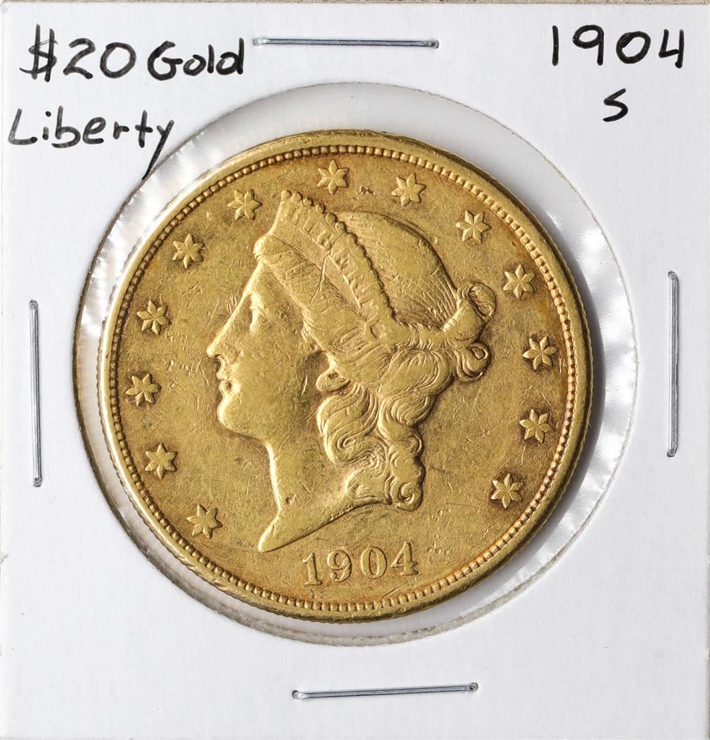 One 1904-S $20 Liberty Head Double Eagle Gold Coin.