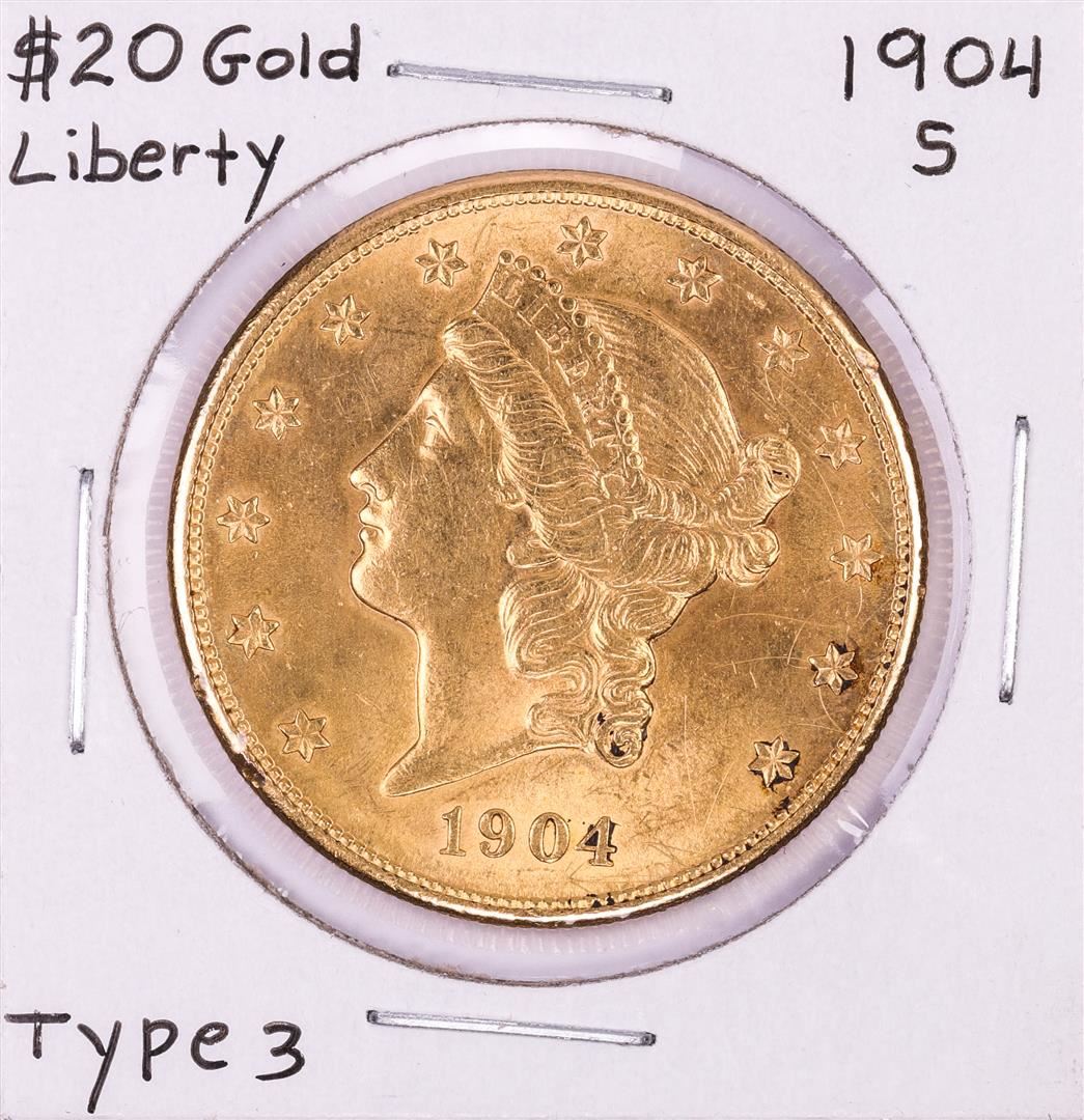 One 1904-S $20 Liberty Head Double Eagle Gold Coin.