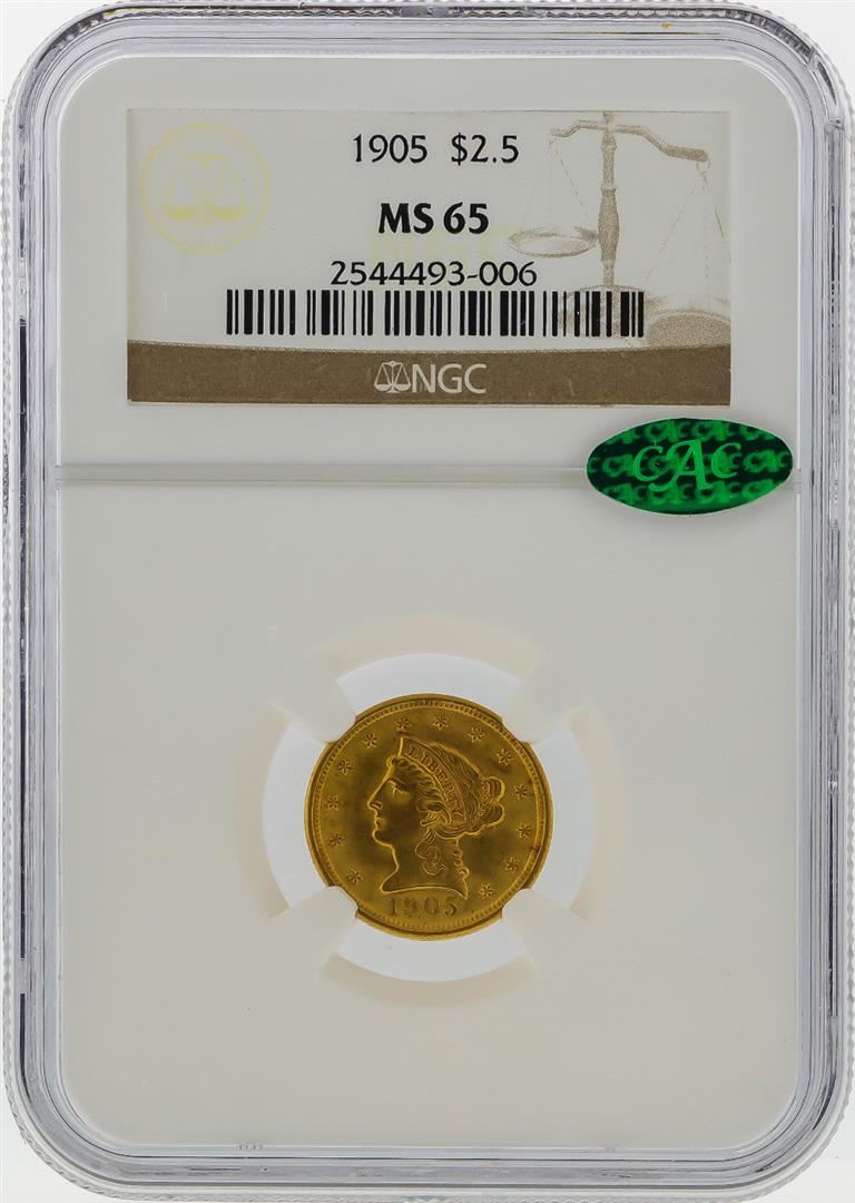 One 1905 $2 1/2 Liberty Head Quarter Eagle Gold Coin NGC MS65 CAC. NGC Certified.