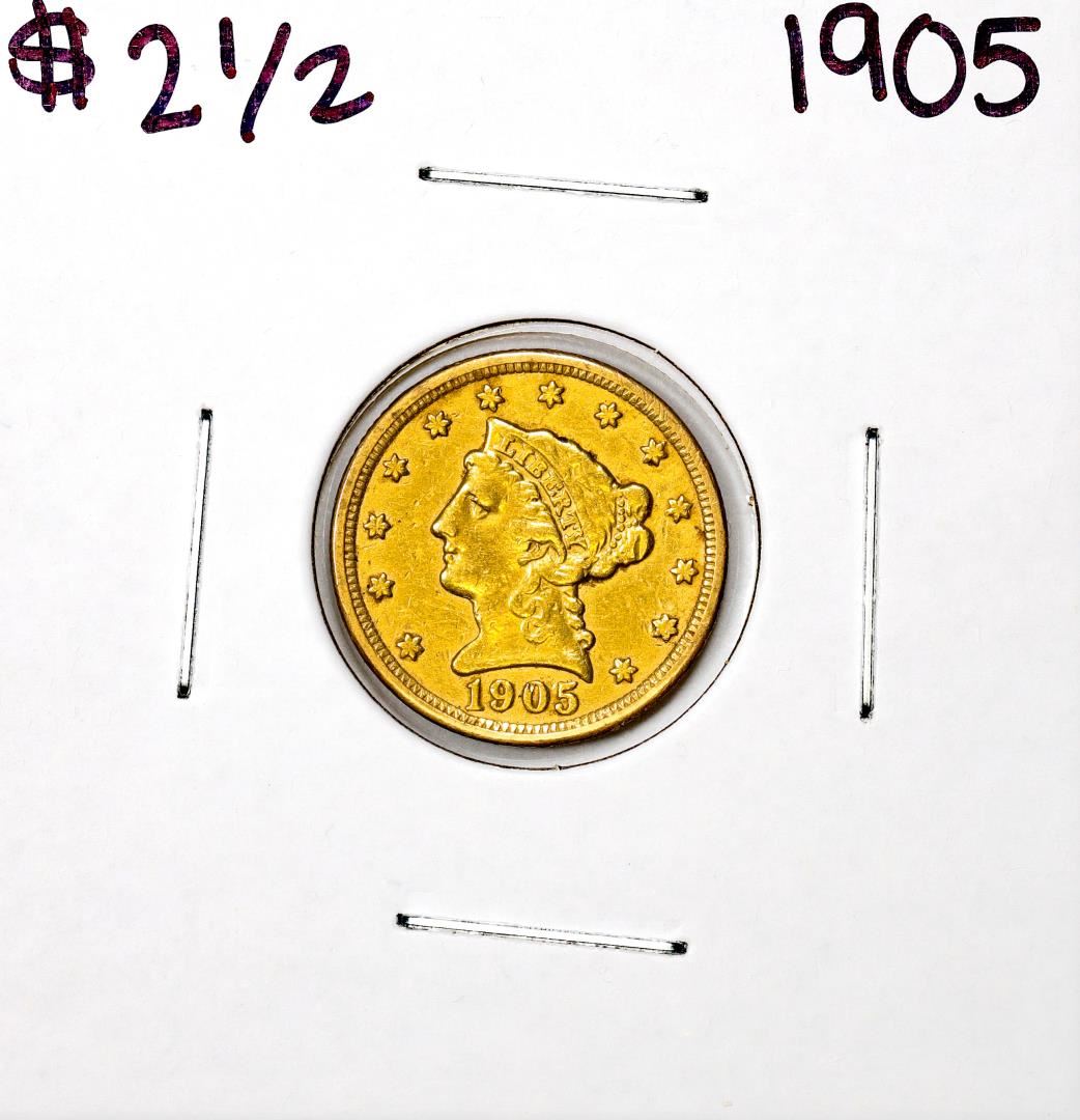 One 1905 $2 1/2 Liberty Head Quarter Eagle Gold Coin.