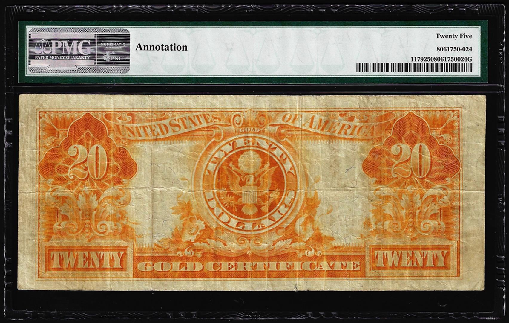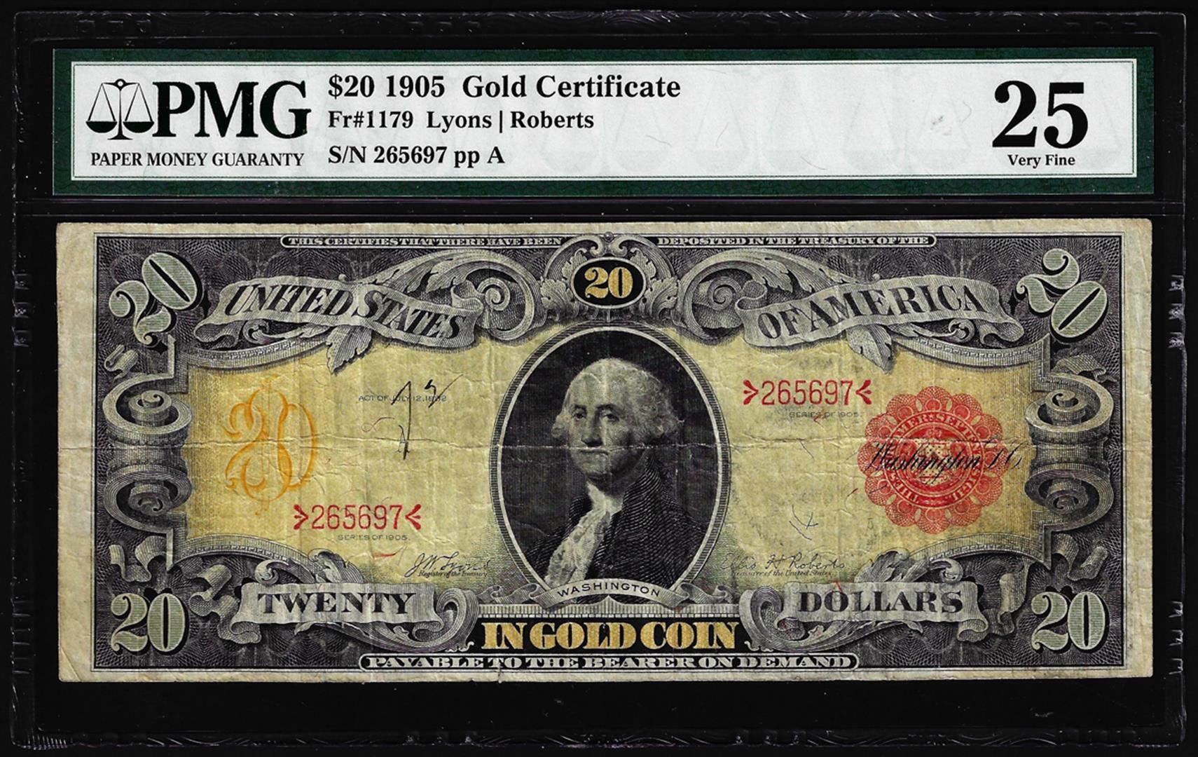 One 1905 $20 Technicolor Gold Certificate Note Fr.1179 PMG Very Fine 25. PMG Certified.