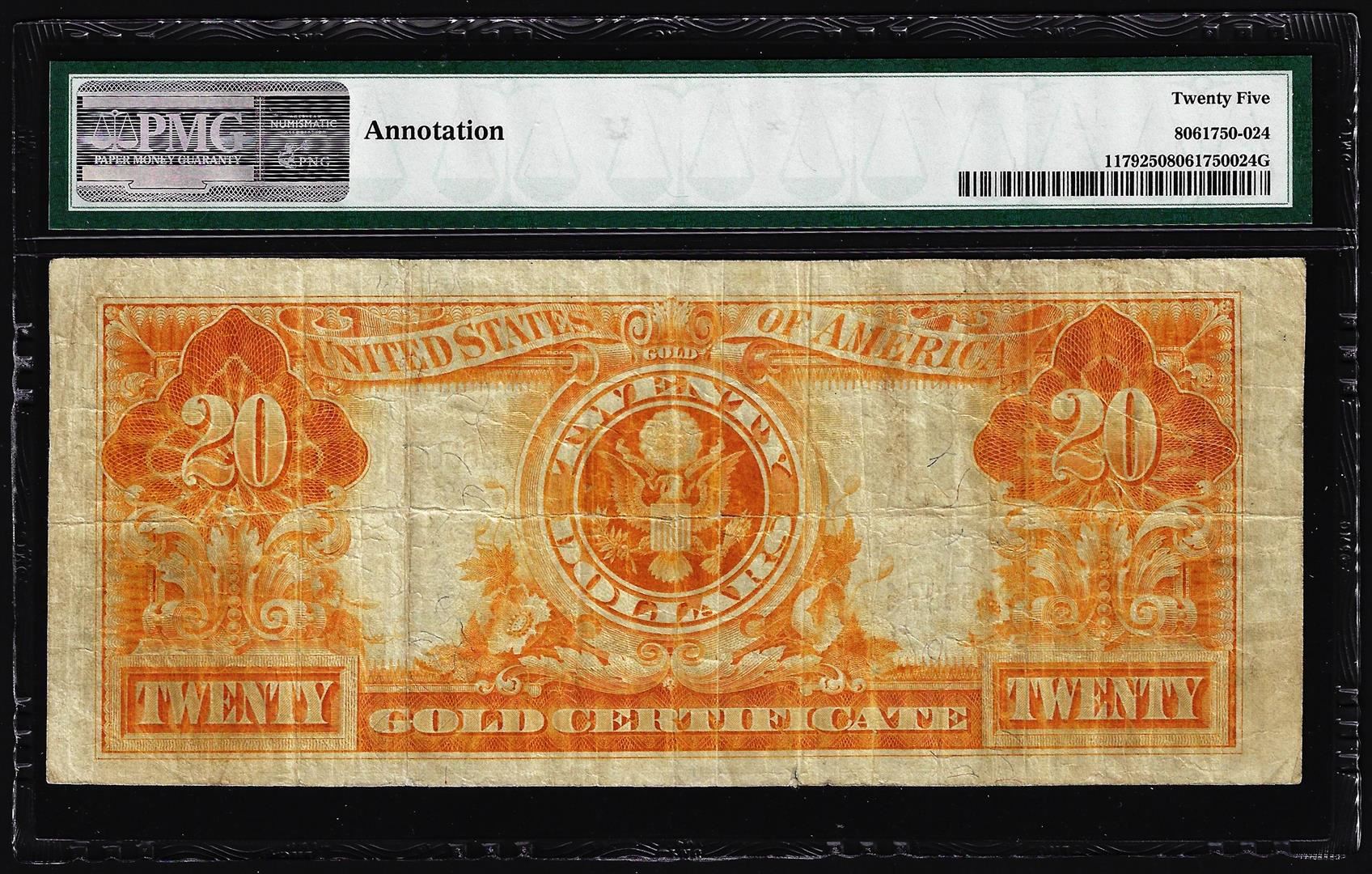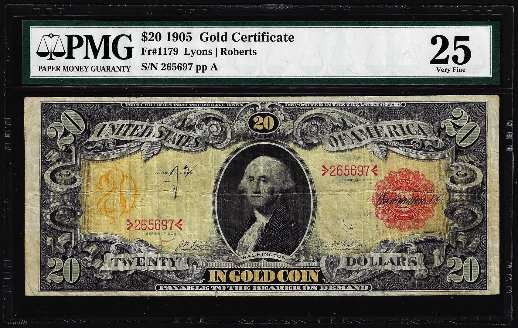 One 1905 $20 Technicolor Gold Certificate Note Fr.1179 PMG Very Fine 25. PMG Certified.