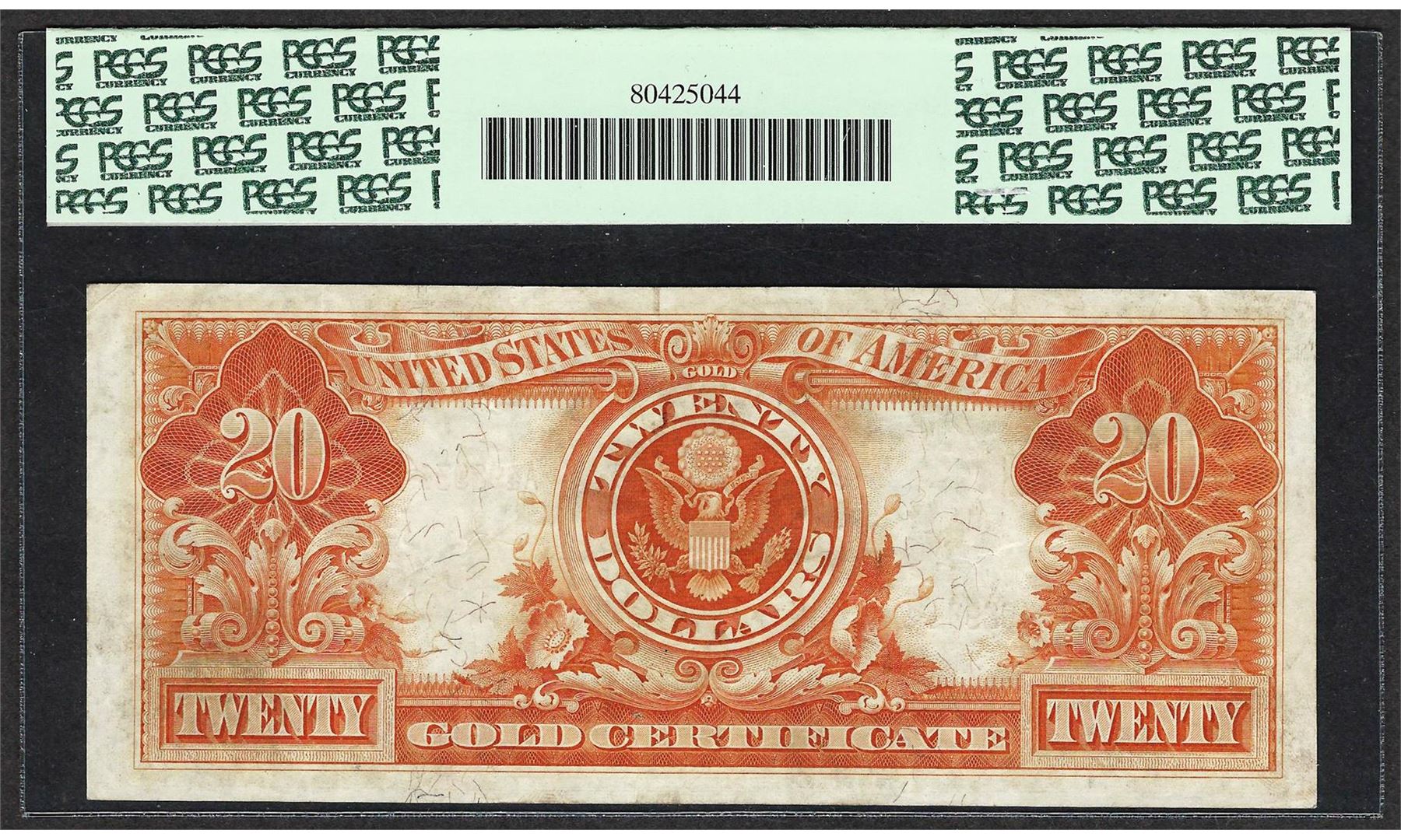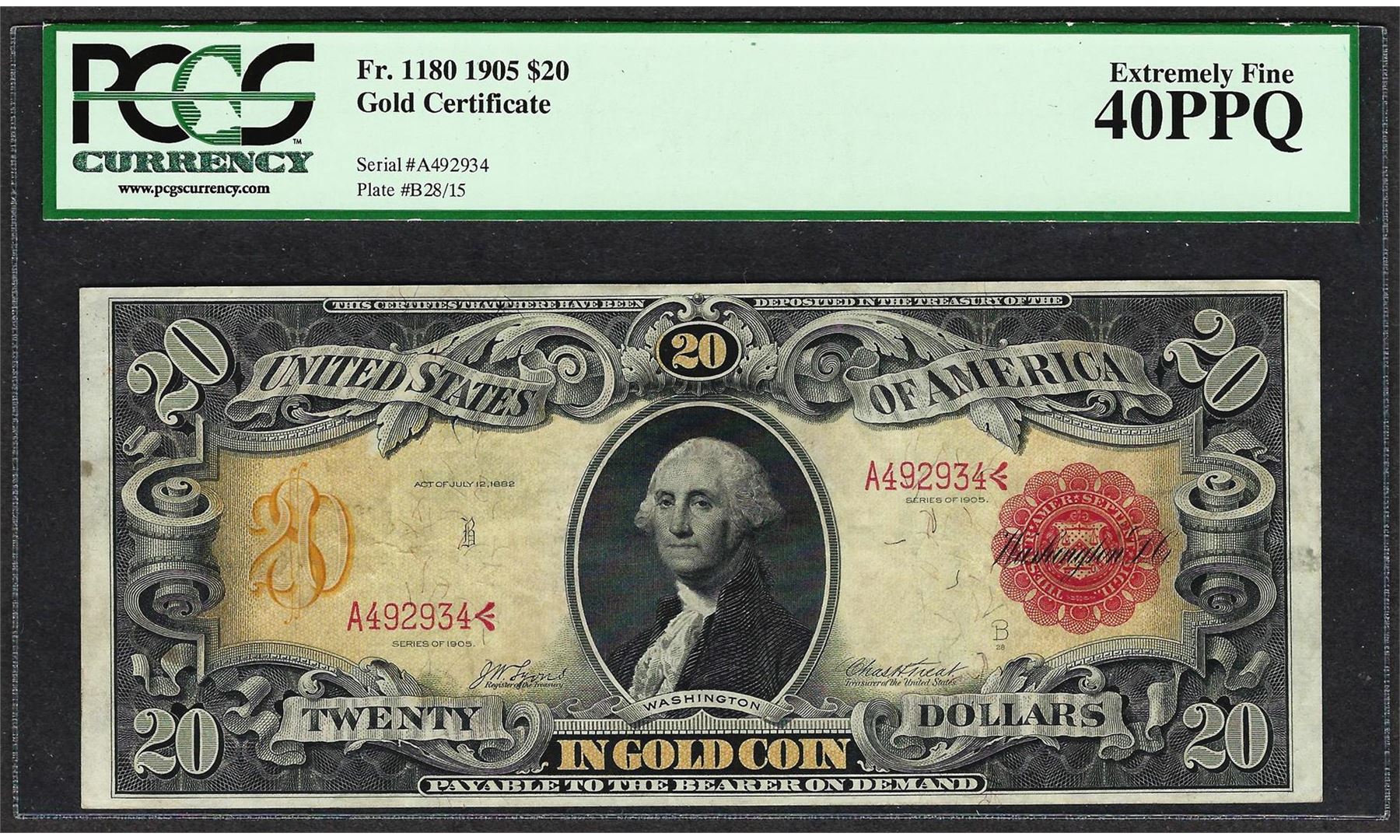 One 1905 $20 Technicolor Gold Certificate Note Fr.1180 PCGS graded Extremely Fine 40PPQ. A fire-engine red overprint and rich golden-yellow color make this an above average Extremely Fine for eye appeal, while the PPQ designation and evident embossing testify to the note's originality and paper quality. In all, a premium piece in a very difficult to find grade. PCGS Graded.