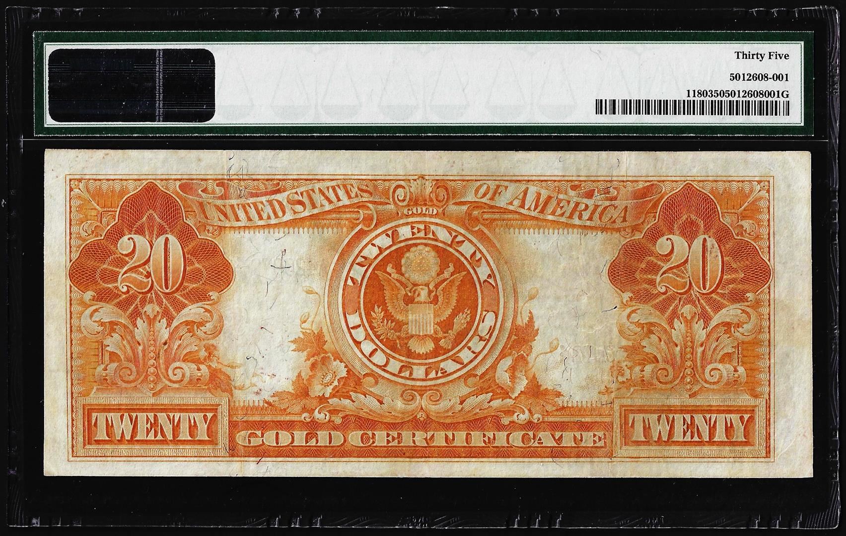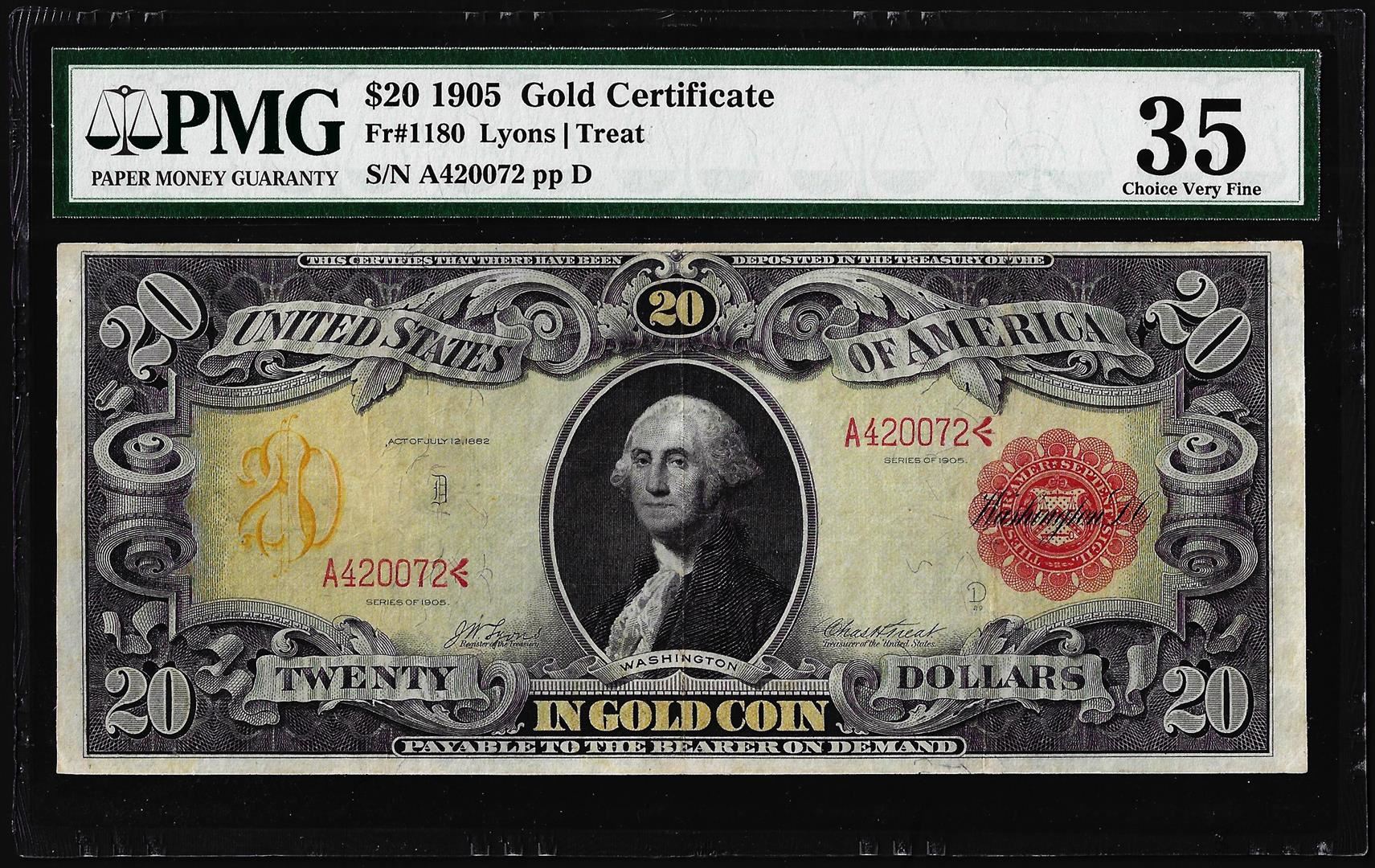 One 1905 $20 Technicolor Gold Certificate Note Fr.1180 PMG Choice Very Fine 35. PMG Certified.