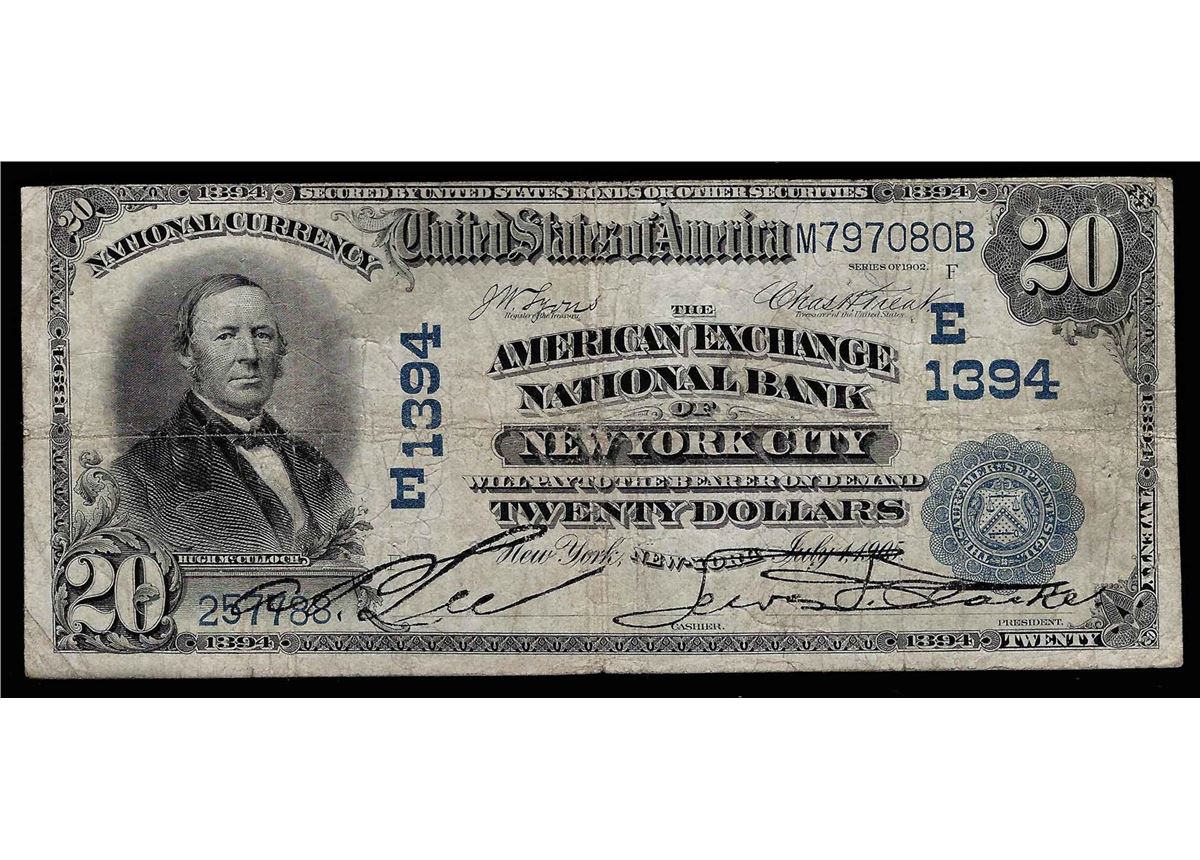 One 1905 $20 The American Exchange National Bank of New York City.