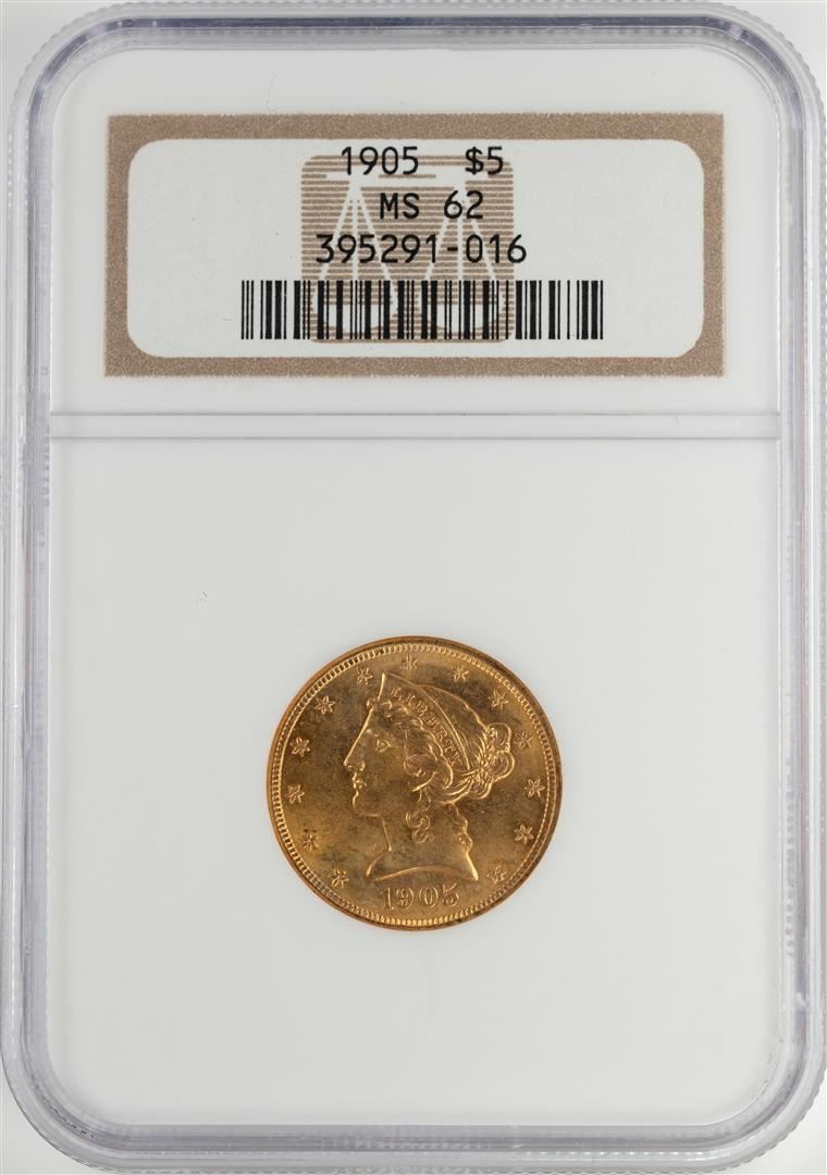 One 1905 $5 Liberty Head Half Eagle Gold Coin NGC MS62. NGC Certified.