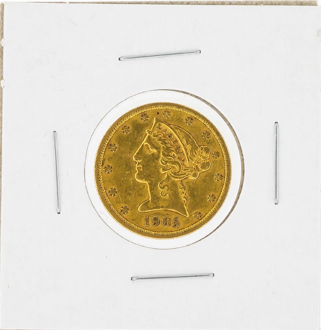 One 1905 $5 Liberty Head Half Eagle Gold Coin.