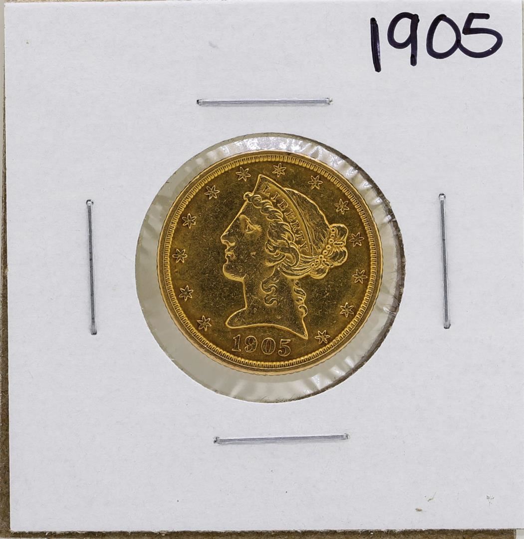 One 1905 $5 Liberty Head Half Eagle Gold Coin.