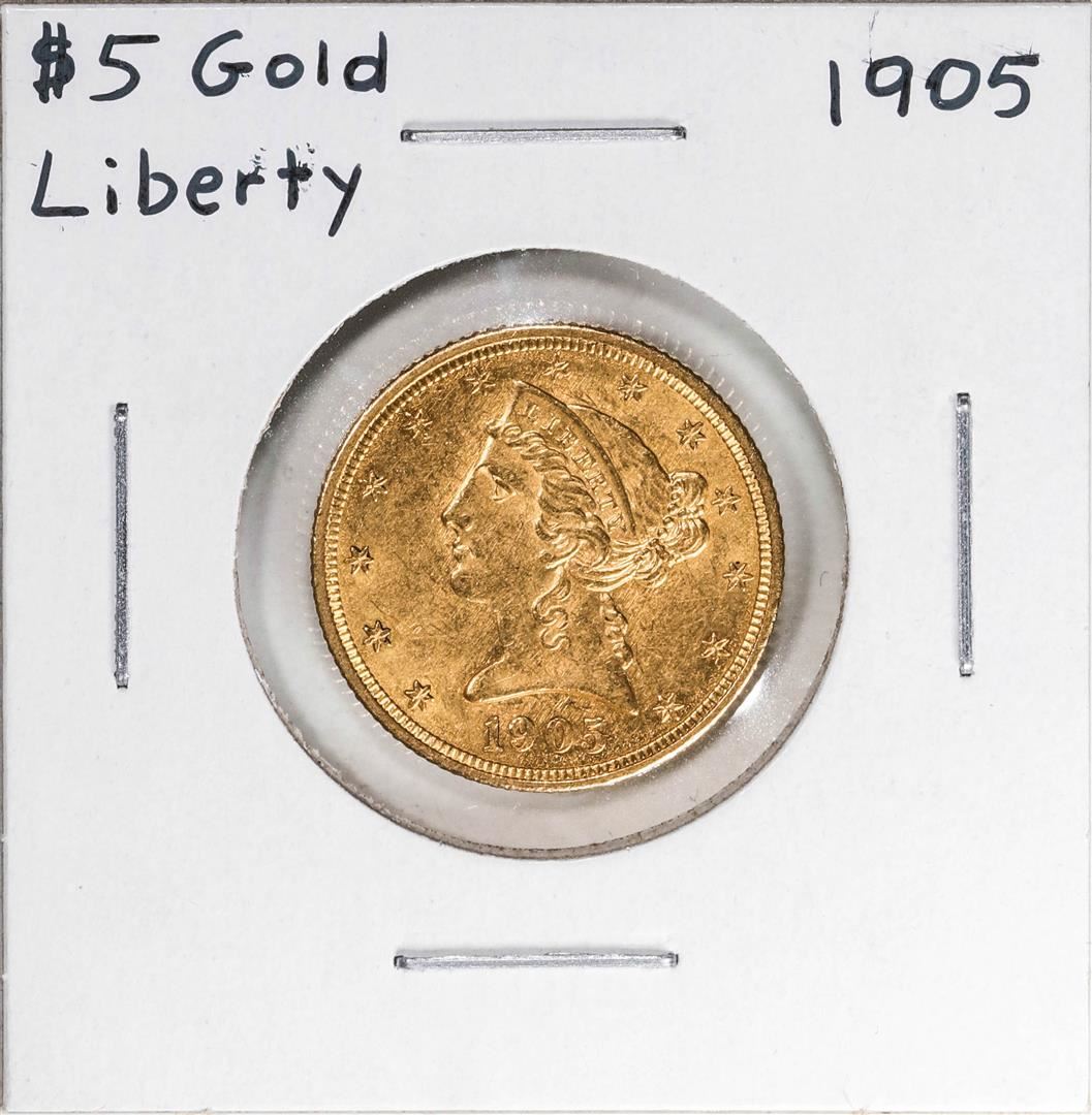 One 1905 $5 Liberty Head Half Eagle Gold Coin.