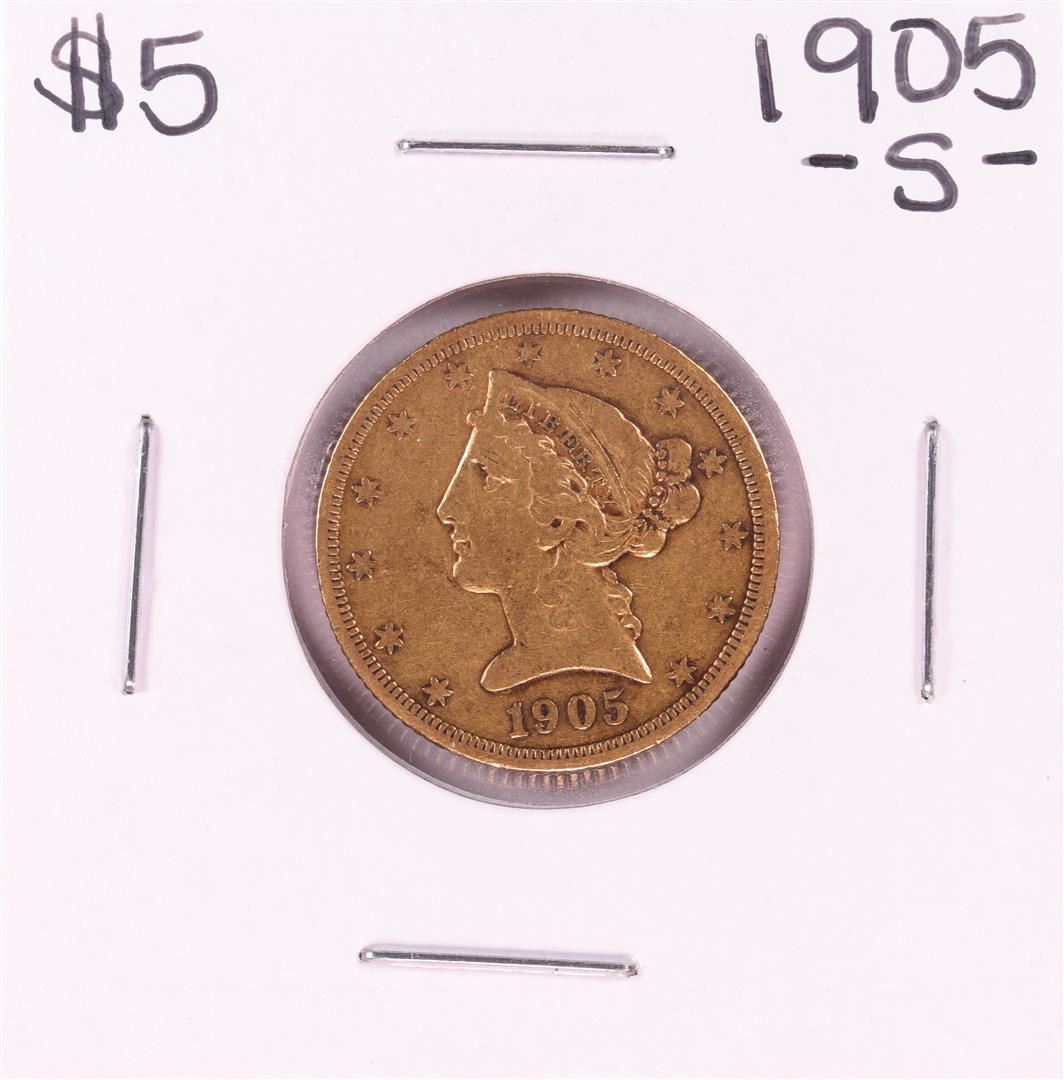 One 1905-S $5 Liberty Head Half Eagle Gold Coin.