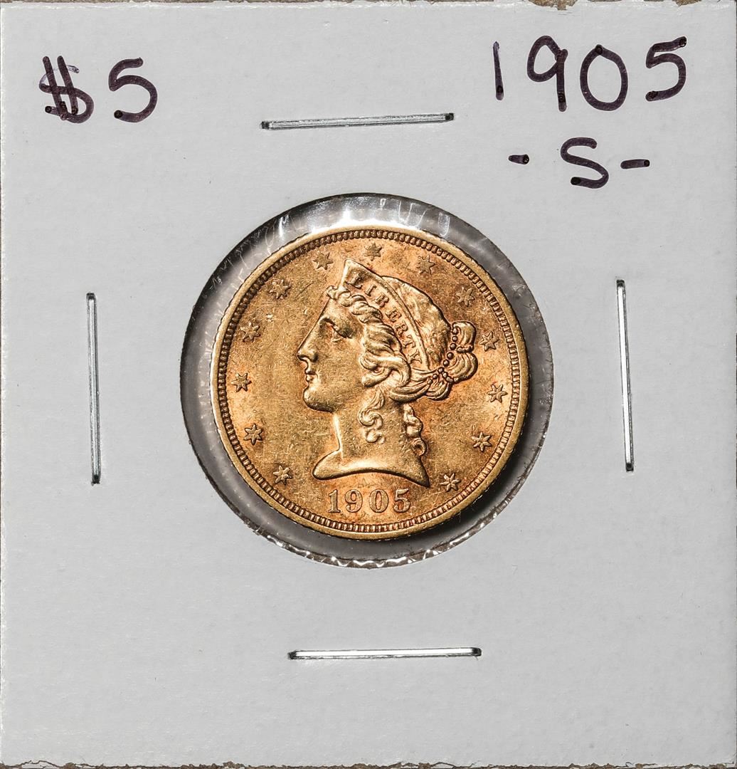 One 1905-S $5 Liberty Head Half Eagle Gold Coin.