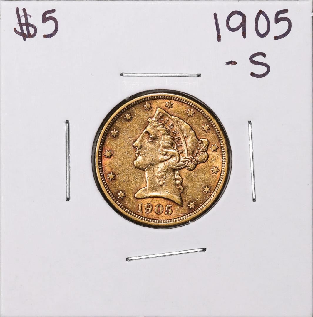 One 1905-S $5 Liberty Head Half Eagle Gold Coin.