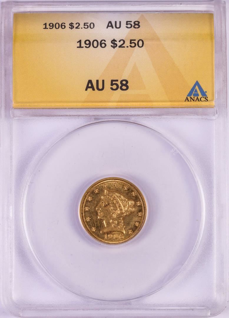 One 1906 $2 1/2 Liberty Head Quarter Eagle Gold Coin ANACS AU58. ANACS Certified.