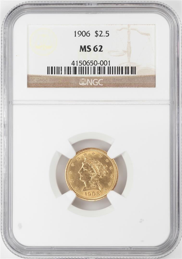 One 1906 $2 1/2 Liberty Head Quarter Eagle Gold Coin NGC MS62. NGC Certified.
