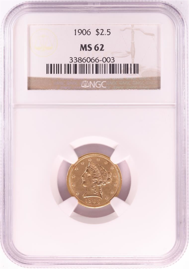 One 1906 $2 1/2 Liberty Head Quarter Eagle Gold Coin NGC MS62. NGC Certified.