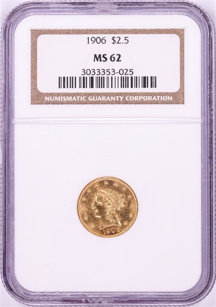 One 1906 $2 1/2 Liberty Head Quarter Eagle Gold Coin NGC MS62. NGC Certified.