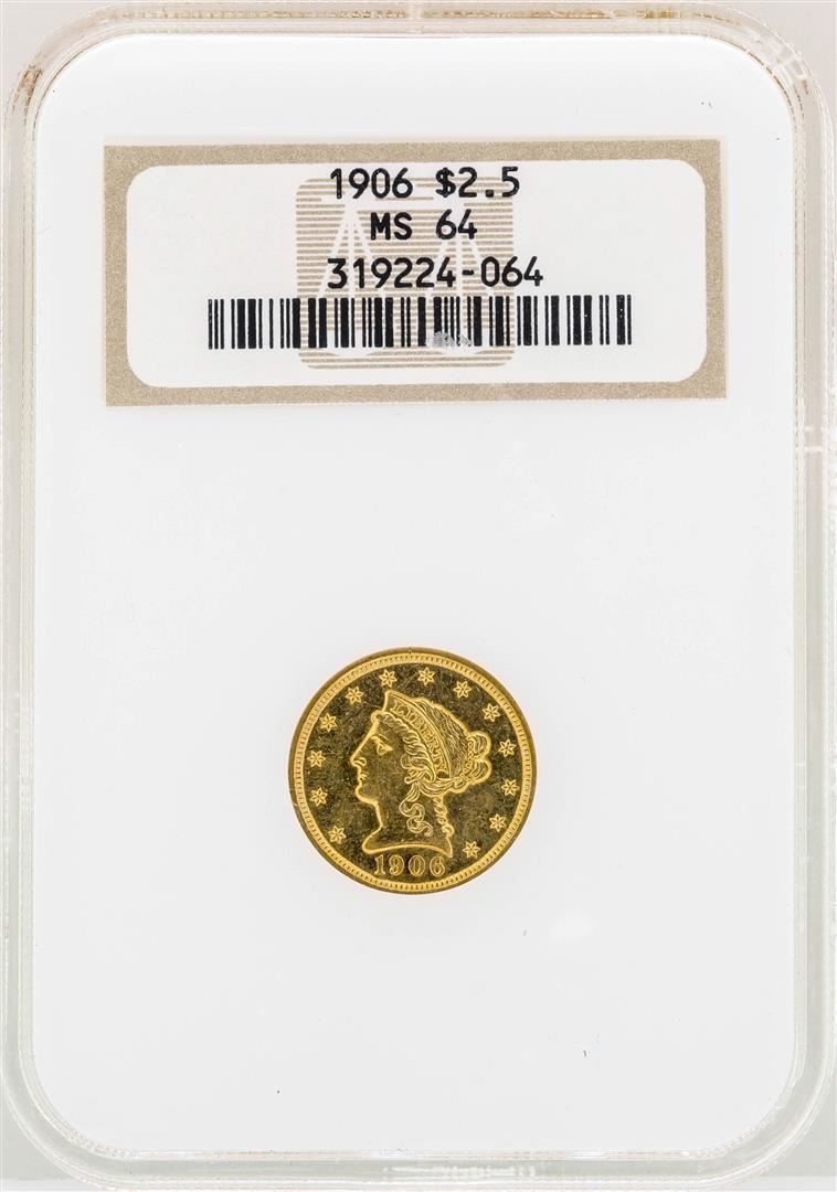 One 1906 $2 1/2 Liberty Head Quarter Eagle Gold Coin NGC MS64. NGC Certified.