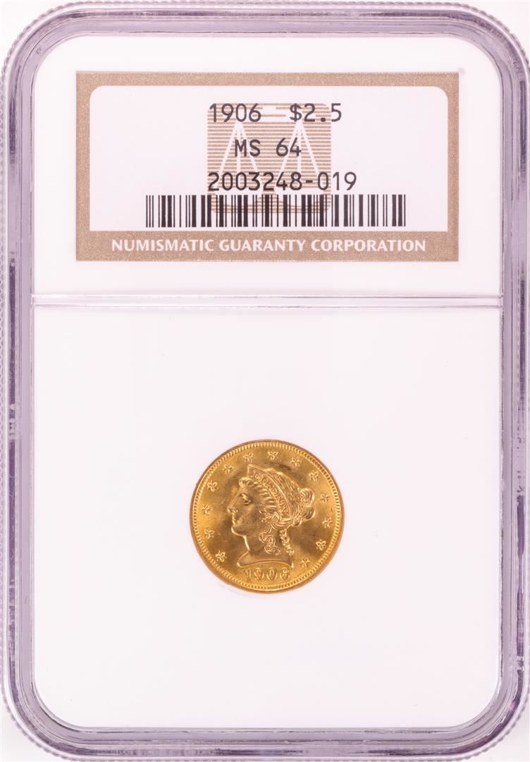 One 1906 $2 1/2 Liberty Head Quarter Eagle Gold Coin NGC MS64. NGC Certified.