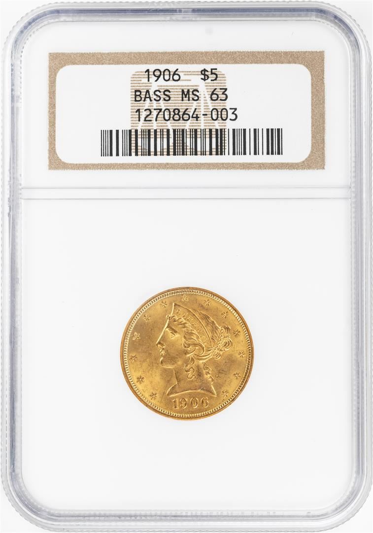 One 1906 $5 Liberty Head Half Eagle Gold Coin NGC MS63 Bass Collection. NGC Certified.