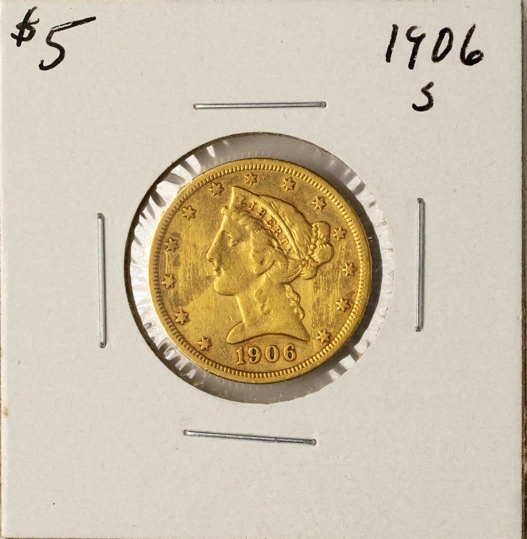 One 1906-S $5 Liberty Head Half Eagle Gold Coin.