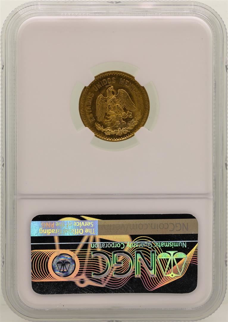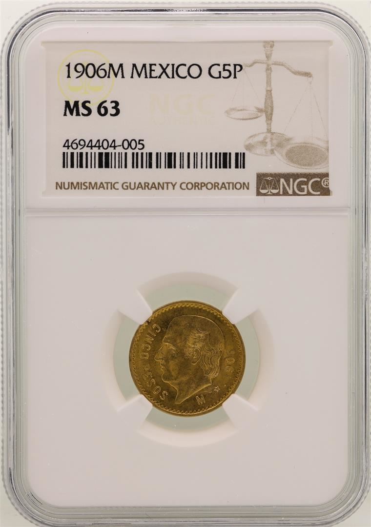 One 1906M Mexico 5 Pesos Gold Coin NGC MS63. NGC Certified.
