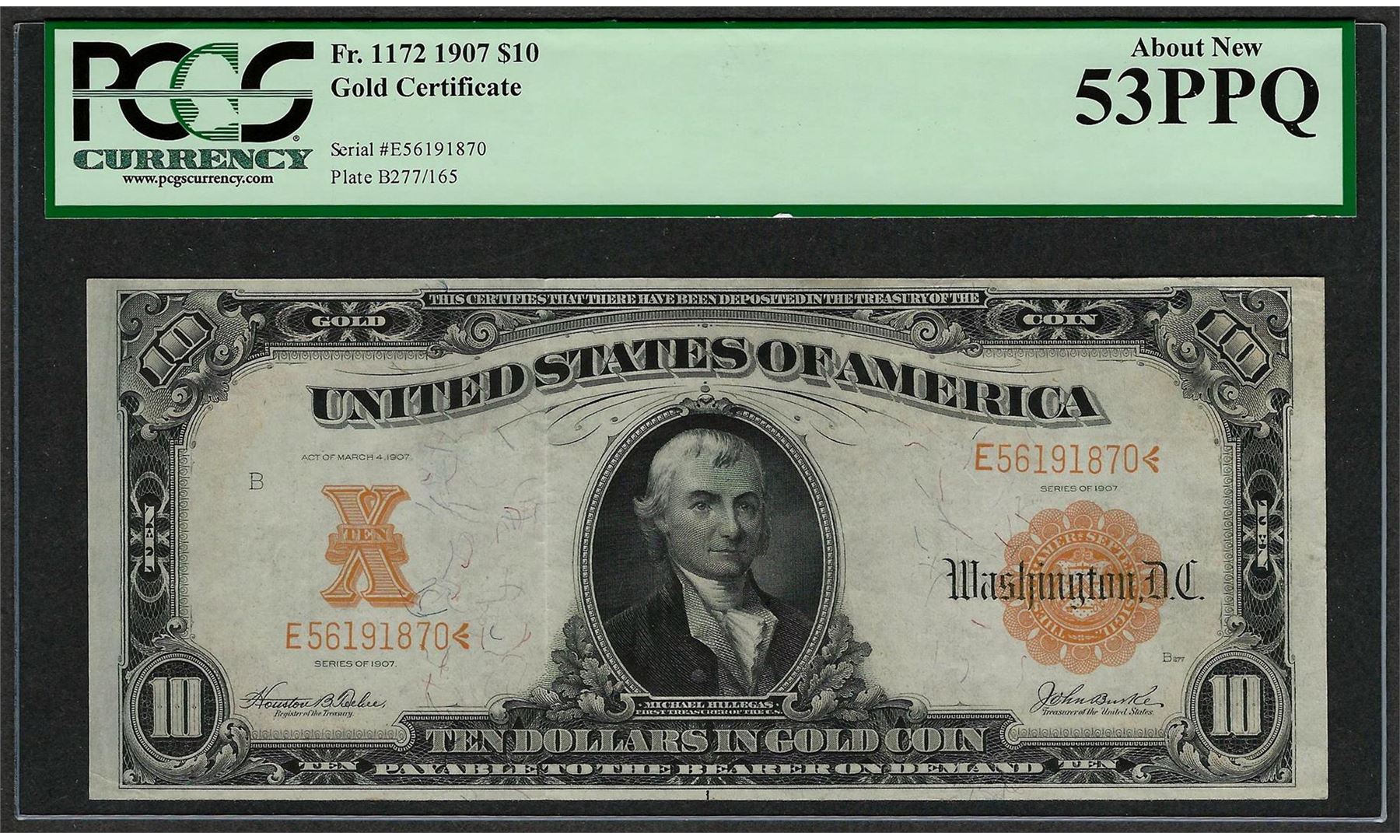 One 1907 $10 Gold Certificate Note Fr.1172 PCGS About New 53PPQ. PCGS Graded.
