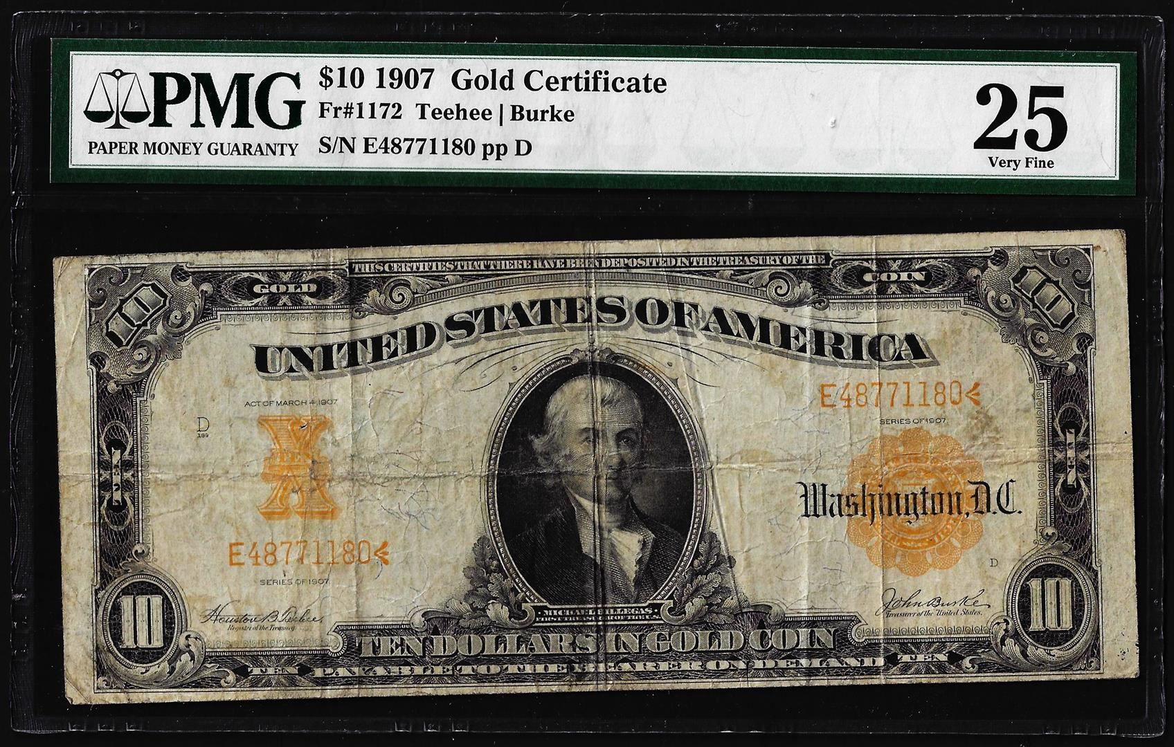 One 1907 $10 Gold Certificate Note Fr.1172 PMG Very Fine 25. PMG Certified.