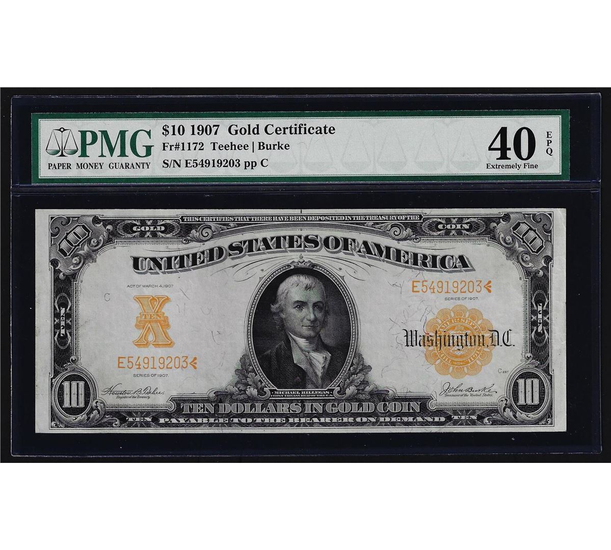 One 1907 $10 Gold Certificate Note PMG Extremely Fine 40EPQ. PMG Certified.